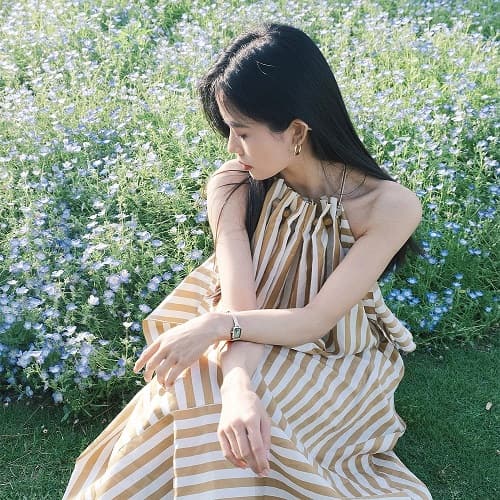Cassa rettangolare 15x18 mm in acciaio inox pvd oro. Quadrante verde emerald effetto sunray con sfere ed indici oro. Cinturino in acciaio pvd oro maglia mesh (maglia milanese) di larghezza 6 mm, con chiusura regolabile. Resistente all'acqua fino a 3 atm.