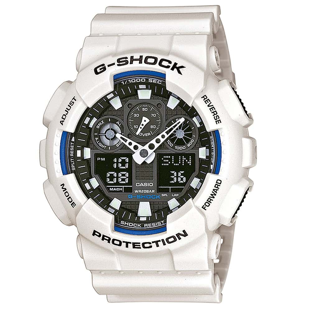 Men's watch Casio G-Shock ref. GA-100-1A1ER multifunction. 51 mm resin case, black analog digital display with red details. Waterproof up to 20 bar. Black resin strap, buckle closure.
