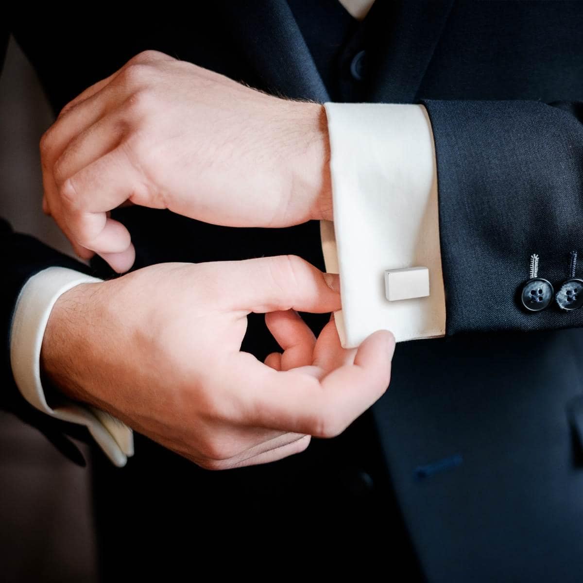 Gemelli da polsino in acciaio di forma rettangolare con lavorazione liscia e lucida. Dimensioni 12x18 mm.