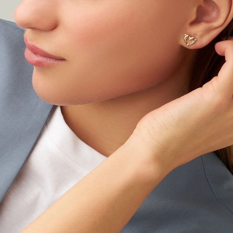 Orecchini da donna Stroili collezione Bon Ton ref. 1410325 in oro giallo 375/1000 con delfini che formano un cuore. Chiusura con farfallina in silicone.
