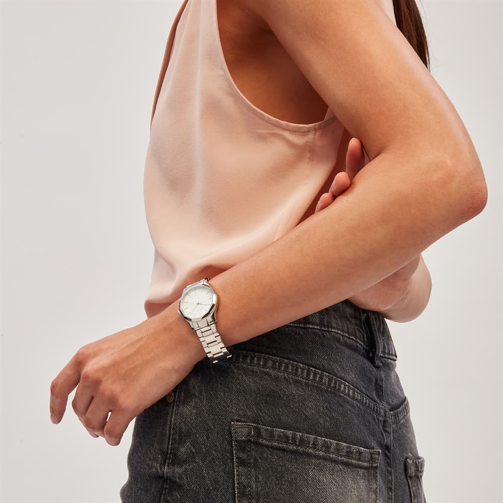 Cassa da 32 mm in acciaio inossidabile, quadrante bianco con morivo a raggiera, indici e sfere silver. Lunetta sfaccettata. Bracciale in acciaio, chiusura deployante. Impermeabile fino a 10 bar. Peso 85 gr.