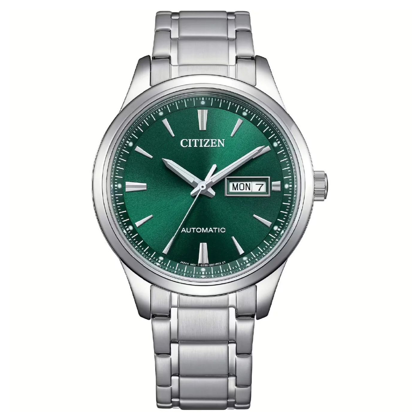 Cassa in acciaio da 40 mm. Movimento meccanico a ricarica automatica con riserva di carica di 40 ore. Quadrante verde con indici e datario e giorno della settimana. Fondo serrato a vite con oblò trasparente e movimento a vista. Bracciale in acciaio, chiusura pieghevole con pulsanti. Impermeabile fino a 10 bar.