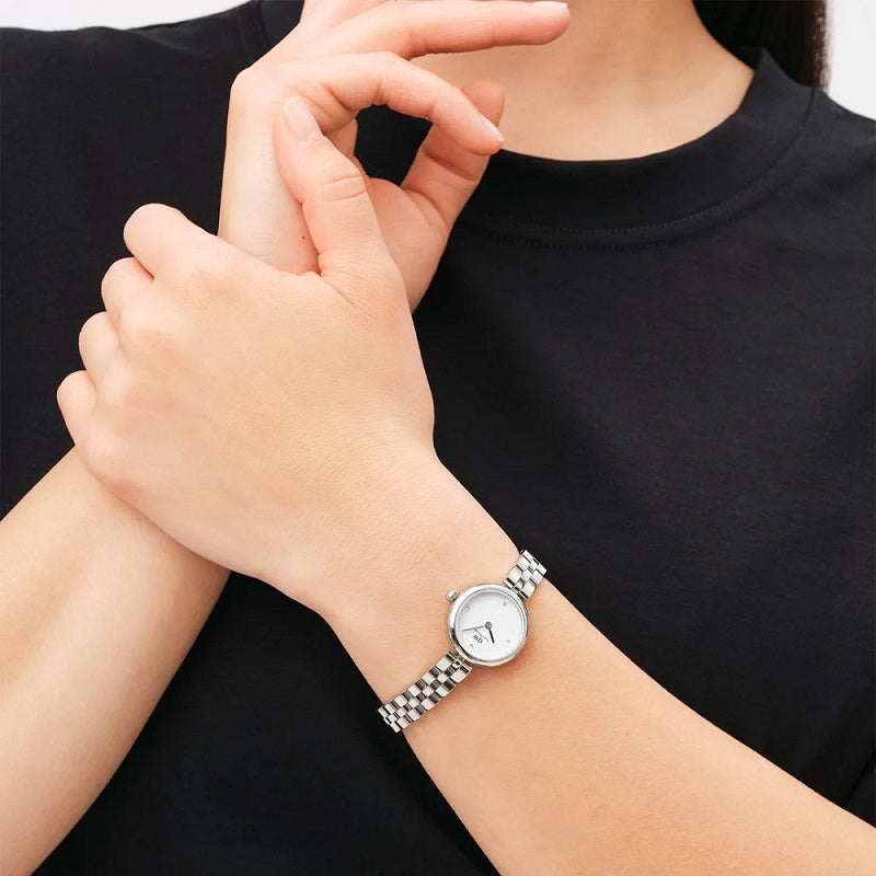 Cassa da 22 mm in acciaio. Quadrante bianco con sfere oro ed indici costituiti da cristalli bianchi. Bracciale in acciaio intercambiabile. Resistente all'acqua fino a 3 atm.