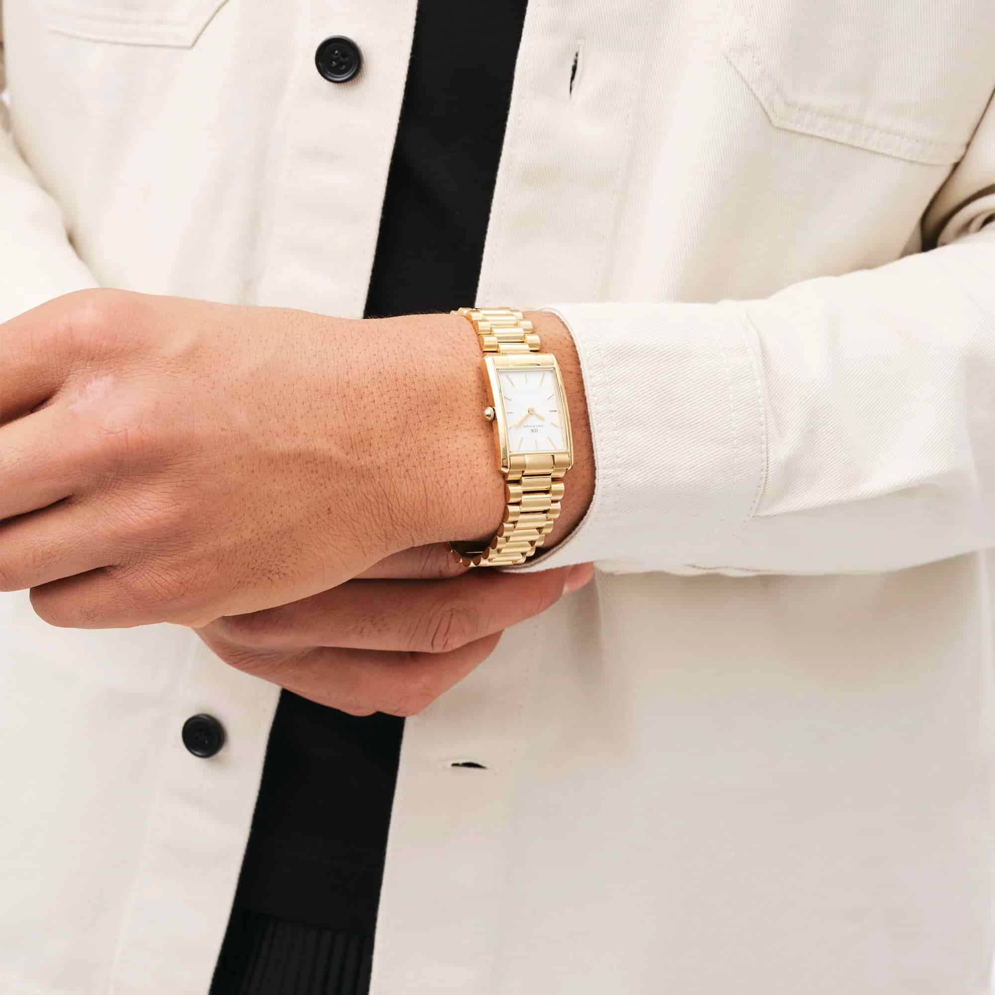 Cassa rettangolare 35x24 mm in acciaio inox dorato. Quadrante bianco con sfere ed indici. Bracciale in acciaio. Resistente all'acqua fino a 3 atm.