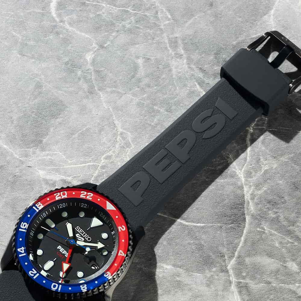 Cassa da 42 mm in acciaio inossidabile con rivestimento SKX nero. Lunetta girevole unidirezionale Pepsi (blu e rossa). Sul fondello a vite con movimento a vista sono presenti il logo PEPSI, l'incisione Limited Edition e il numero di edizione limitata. Quadrante nero con logo PEPSI, datario e giorno della settimana bilingue Inglese/Giapponese, sfere ed indici luminescenti. Cinturino in silicone nero, ansa da 22 mm, chiusura con fibbia. Movimento meccanico automatico calibro 4R34 con riserva di carica di 41 ore, funzione GMT e possibilità di carica manuale. Vetro Hardlex (vetro minerale temperato). Water resistant fino a 100 metri.